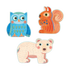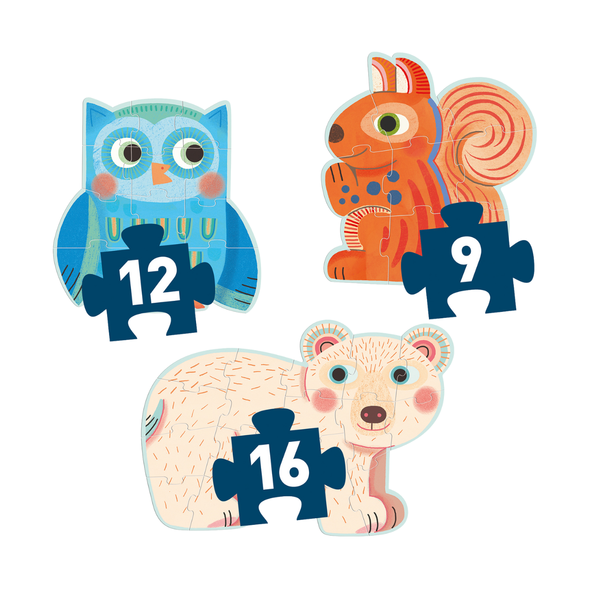 A beautifully designed progressive puzzle featuring three adorable forest friends — a 9-piece squirrel, a 12-piece owl, and a 16-piece bear. Each animal puzzle increases in difficulty, helping little ones build confidence as they progress from one to the next.