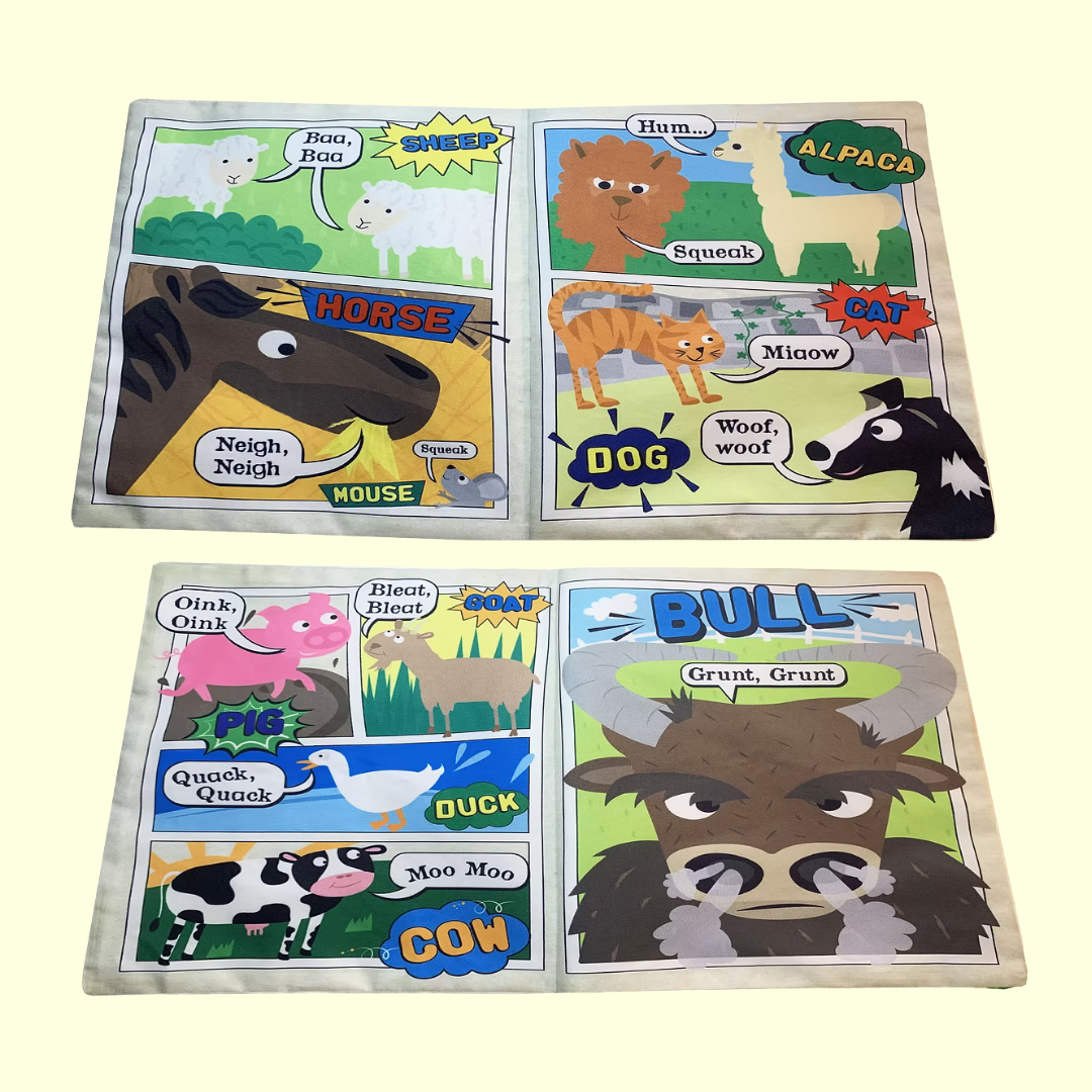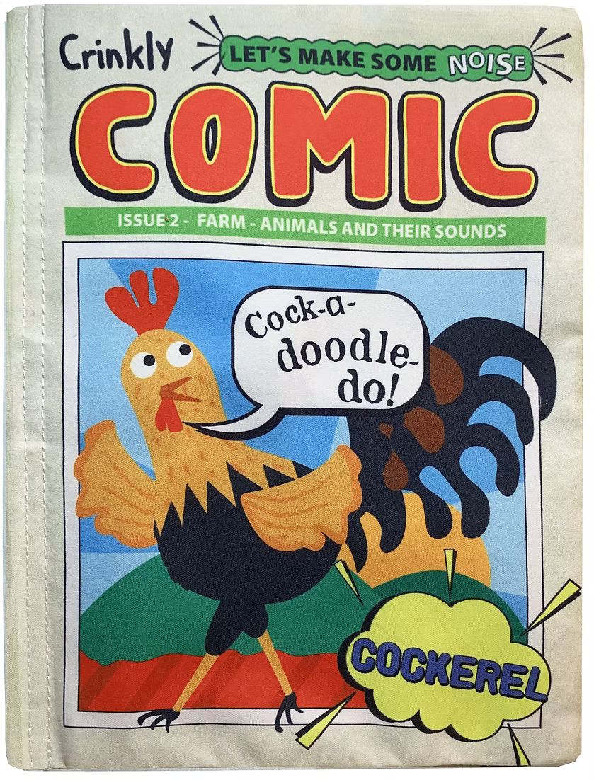 A fun new crinkly comic designed especially for babies! Featuring friendly farm animals and their sounds, this soft cloth book is styled like a traditional comic with flashes and speech bubbles for extra charm.