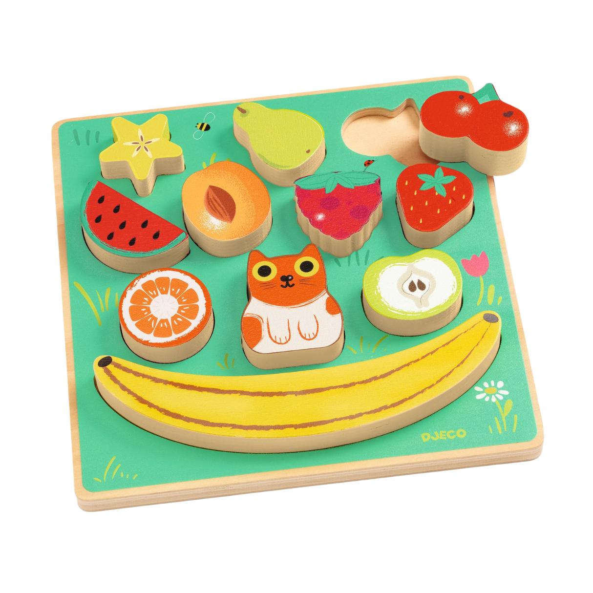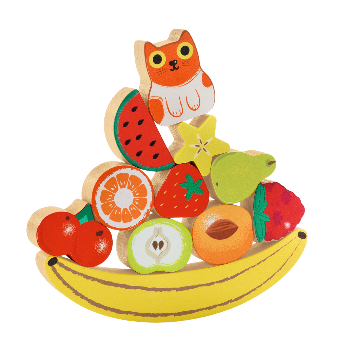 Puzz & Boom is a delightful wooden shape-sorting puzzle and balancing game in one. Featuring 11 chunky, colourful pieces—including fruit and a playful cat—this interactive toy encourages both problem-solving and imaginative play. The sturdy banana-shaped base doubles as the foundation for a fun stacking challenge!