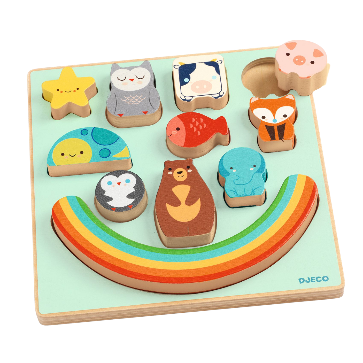 Puzz & Boom is a charming wooden shape-sorting puzzle and balancing game in one. With 11 colourful 3D animal pieces and a rainbow-shaped base, children can enjoy sorting the shapes or stacking them into a playful pyramid. It’s a fun and engaging way to encourage creativity and coordination.