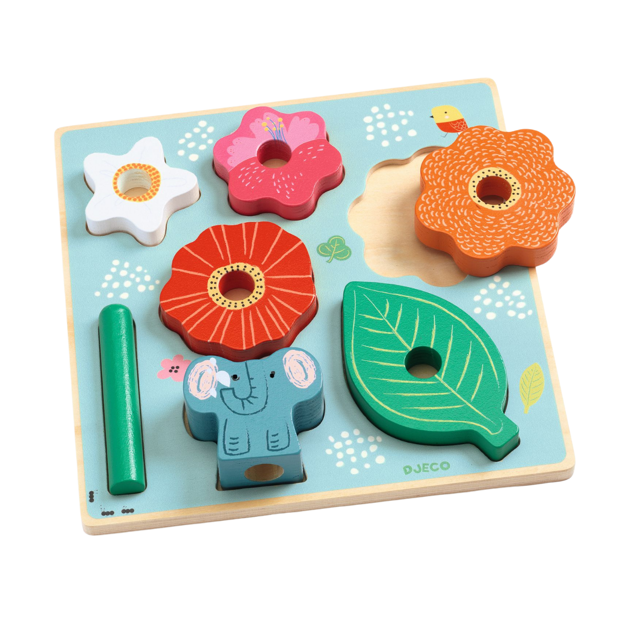 Puzz & Stack is a delightful wooden shape-sorting puzzle and stacking toy designed to charm little ones. With 7 flower-shaped pieces and a cute elephant topper, children can build a colourful pyramid by stacking the flowers on a central wooden peg.