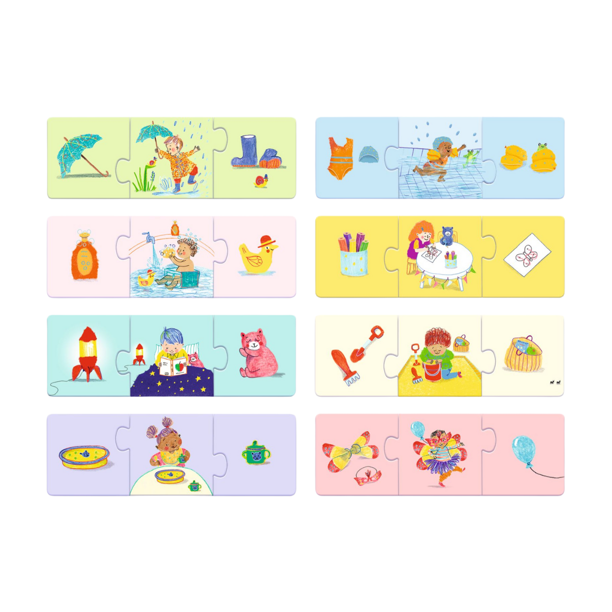 Puzzle Trio – My Daily Life is a sequencing puzzle where children match three pieces to show simple daily routines, from getting up in the morning to bedtime. Each finished trio tells a mini-story in a fun, visual way.
