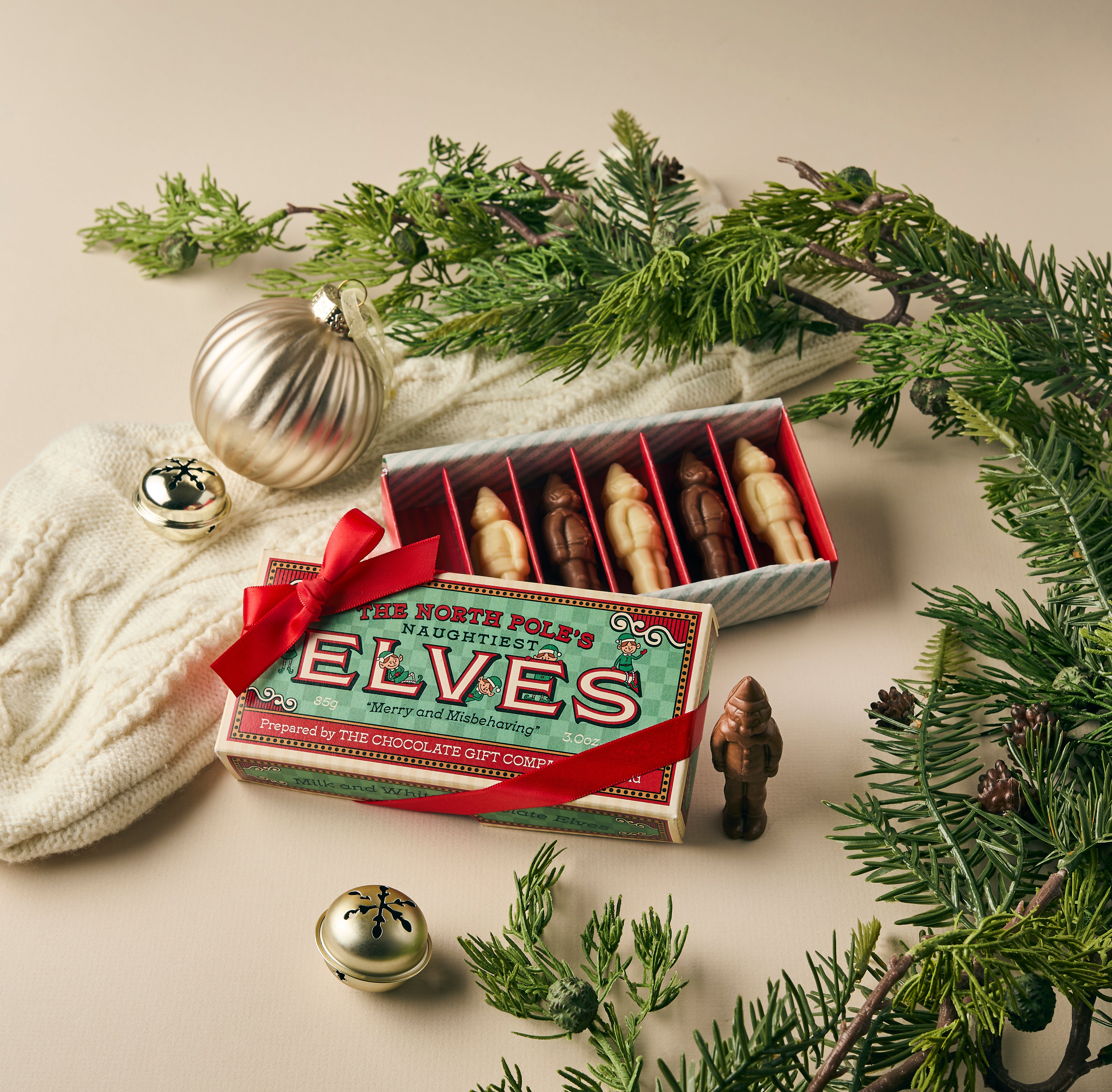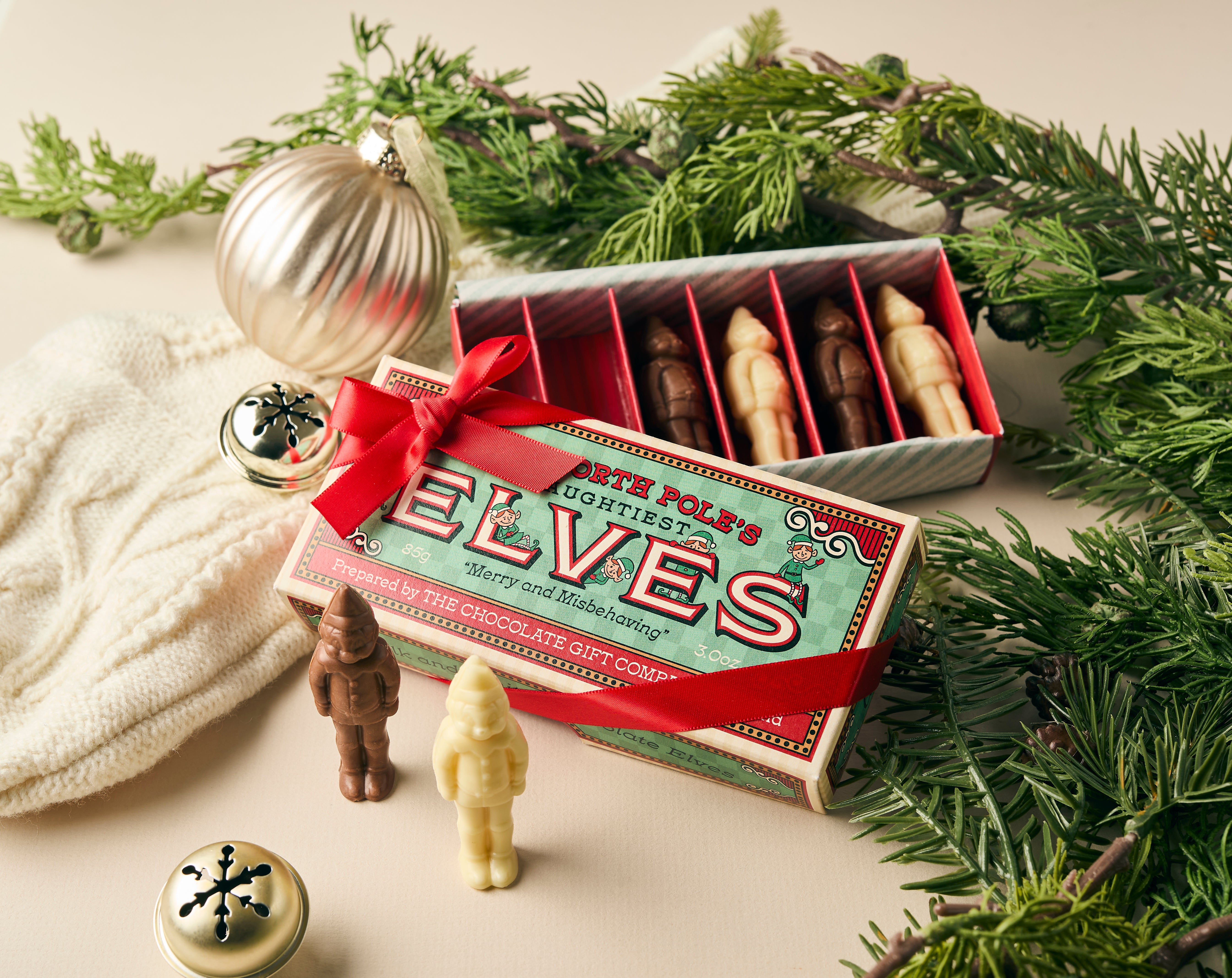 Untie the ribbon to reveal six cheeky little elves — each one made from solid milk and white chocolate, lined up and ready for a festive nibble!